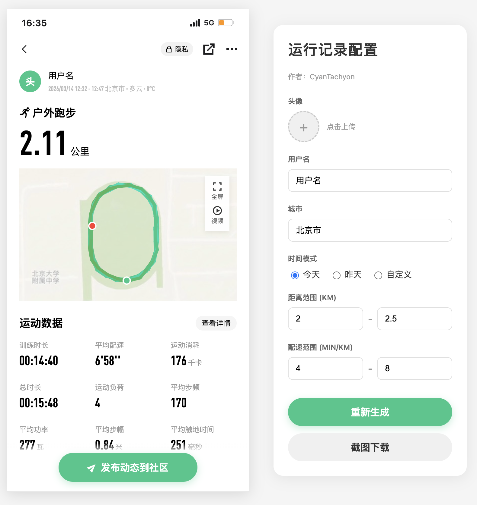 生成在北大附中操场上的假keep截图,开箱即用,理论上只需要填用户名和头像,其余配置一切默认即可。